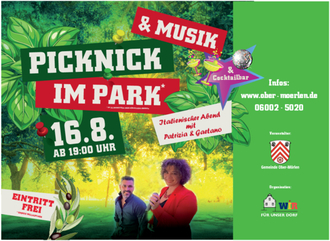 Zum Ausklang der Sommerferien steigt am Samstag, 16. August, im Schlosspark das vierte „Picknick mit Musik im Park“ (PiMP). Motto ist dieses Mal ein italienischer Abend mit Livemusik, Cocktailwagen und stimmungsvoller Parkbeleuchtung. Decken, Kissen, Klappstühle, Essen und was man sonst noch braucht für ein gemütliches Picknick mit Freunden, bringt jeder selbst mit. Das bekannte Wetterauer Duo „Patrizia & Gaetano“ - Patrizia Rosini und Gaetano Trinaccio - wird mit einer prickelnden Mischung italienischer Lieder für große Emotionen, Dolce Vita und jede Menge tanzbare Lebensfreude sorgen. Die faszinierende Illuminierung des Schlossparks gestalten einmal mehr Lichtmeister Norbert Mohr und Torben Dietz, erstmalig wird die rollende Cocktailbar „Die Dorftante“ die Gaumen verwöhnen.