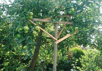 Am besten ist es also, Astbruch zu verhindern. Dafür gibt es jetzt zwei Möglichkeiten. Auch wenn es manchen Baumbesitzern sicherlich schwer fällt, vor der Ernte zur Schüttelstange zu greifen: Das Abschütteln von zu viel Behang ist eine sofort umsetzbare und wirkungsvolle Notmaßnahme. Dabei fängt man ganz außen an und schüttelt vorsichtig so viele Früchte ab, bis der Ast sichtbar entlastet ist. Eine etwas aufwendigere Alternative ist das Abstützen der Äste mit Holzstangen (siehe Foto). Beim Baumschnitt im Winter sollte zur Vorbeugung darauf geachtet werden, sehr ausladende Äste zurückzuschneiden, damit die Hebelkräfte erst gar nicht so stark wirken können.