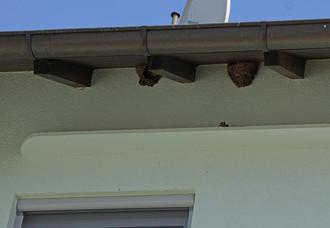 Die Gefahr, dass Nester verloren gehen, ist besonders bei Gebäuderenovierungen groß. Wir möchten über ein positives Beispiel berichten, wie alles getan wurde, um die Brutmöglichkeiten der pfeilschnellen Mitbewohner zu erhalten: An einem Haus in der unteren Frankfurter Straße stand vergangenes Jahr der Neuanstrich an. Familie Glaser-Jones legte die Renovierungsarbeiten auf den Oktober, also auf die Zeit nach dem Wegzug ins Winterquartier. Beim Streichen wurde darauf geachtet, dass die Nester nicht beschädigt werden. Das Gerüst wurde genutzt, um in der Wandfarbe gestrichene Kotbretter im ausreichenden Abstand zu montieren. Oberhalb der Kotbretter kam eine Wandfarbe ohne „Lotuseffekt“ zum Einsatz, damit bei Nestneubauten der Lehm an der Wand kleben bleibt.