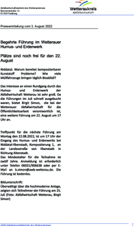 Treffpunkt für die nächste Führung am Montag den 22.08.2022, ist um 17 Uhr der Eingang des Humus- und Erdenwerks bei Niddatal-Ilbenstadt, Kompostierung 1, an der Landesstraße von Ilbenstadt in Richtung Altenstadt. Das Mindestalter für die Teilnahme ist zwölf Jahre. Anmeldung ist erforderlich unter Telefon 06031/906638 oder per E- Mail an b.simon@awb-wetterau.de. Die Führung ist kostenlos.