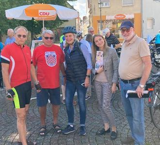 Einen Zwischenstopp legte die CDU Landtagskandidatin Annette Wetekam am vergangen Samstag auf ihrer Radtour durch ihren Wahlkreis ein. Von Mitgliedern des CDU Vorstandes wurde Sie und ihre rund 20-köpfige Gruppe auf dem Kirchplatz in Ober-Mörlen mit Getränken und kleinen Snacks zur Stärkung für die Weiterfahrt herzlich begrüßt. Die anwesenden Bürgerinnen und Bürger konnten Annette Wetekam und ihre Herzlichkeit in kurzen Gesprächen persönlich kennenlernen, bevor sie die Tour über Butzbach und Rockenberg bis zum Ziel Schwyzer Hüsli im Bad Nauheimer Park fortsetzte. CDU-Vorsitzender Gottlieb Burk und Eckhardt Fuß zeigten ihr bei der Durchfahrt von Ober-Mörlen noch die eine oder andere Sehenswürdigkeit in Ober-Mörlen und schlossen sich der Gruppe auf der weiteren Tour an.
