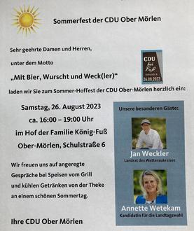26.08.23 16.00 Uhr „Mit Bier, Wurscht und Weck(ler)“ - Sommerfest der CDU im Hof der Familie König-Fuß, Schulstr. 6