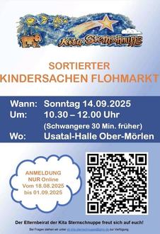Am Sonntag, den 14.09.2025 findet von 10.30 Uhr bis 12.00 Uhr zum wiederholten Male der sortierte Kindersachen Flohmarkt der Kita Sternschnuppe in der Usatal-Halle statt. Es werden viele Klamotten für den Herbst und Winter, sowie eine große Auswahl an Spielsachen, Büchern etc. angeboten. Außerdem stellen wir ein reichhaltiges Kuchenbuffett bereit, welches auch gerne von Nicht-Flohmarktbesuchern genutzt werden darf. Einfach ein Behältnis oder Teller mitbringen und durch den Haupteingang der Usatal-Halle zum Kuchenbuffett kommen und mit dem Kauf eines Kuchens die Kita Sternschnuppe unterstützen.