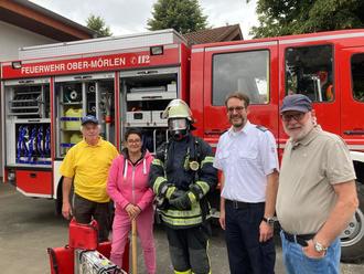 Von links nach rechts: Jürgen Schneider und Lucia Feuerstein vom Seniorenbeirat, Wehrführer Sascha Hauschild, Gemeindebrandinspektor Christoph Dietz, 1. Beigeordneter Gottlieb Burk