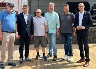 Treffen im Rahmen des Dorffestes: Gottlieb Burk (Gemeindeverbandsvorsitzender), Ministerpräsident Boris Rhein, Ehrenvorsitzender und Mitglied des Gemeindevorstands Josef Freundl, Fraktionsvorsitzender Dr. Matthias Heil, Bauausschussvorsitzender Johannes Heil, Landrat Jan Weckler (v.l.n.r.)