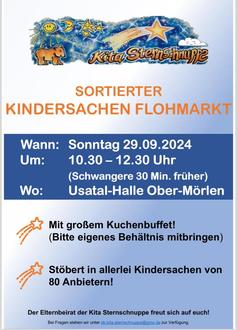 Am Sonntag, den 29.09.2024 findet von 10:30-12:30 Uhr zum wiederholten Male der sortierte Kindersachen Flohmarkt der Kita Sternschnuppe in der Usatal-Halle statt. Wir freuen uns, dass der Flohmarkt jedes Jahr so viele Interessenten anzieht. Auch in diesem Jahr, bietet der Flohmarkt wieder viele sortierte Klamotten für den Herbst und Winter. Zudem gibt es eine große Auswahl an Spielsachen, Büchern und vielem mehr. Vorbeischauen lohnt sich!