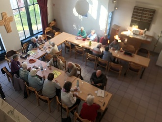 Jeden Montag um 14:30 Uhr treffen sie sich, die Senioren des AWO Montagstreffs im evangelischen Gemeindehaus. Nach Kaffee und Kuchen - zurzeit meist Apfel- und Zwetschenkuchen - stimmen sie unter der Leitung von Beate zunächst ein paar Lieder an. Der absolute Hit ist immer noch das Lied von den „Hohen Tannen“. Danach wird gespielt und erzählt. Ganz unterschiedliche Spiele können angeboten werden. So gibt es eine Gruppe, die gerne Skat spielt. Eine andere beschäftigt sich mit Rummy, eine dritte Gruppe spielt die Klassiker Mensch ärgere dich nicht oder Halma. Aber auch Skipbo wird gerne genommen oder Den Letzten beißen die Hunde. So geht die Zeit bis um 17 Uhr schnell vorbei.