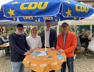 (v.l.) CDU-Vorsitzender Gottlieb Burk mit der 1. Kreisbeigeordneten Birgit Weckler, Dr. Thomas Pauls (MdB) und Landrat Jan Weckler beim CDU Sommerfest in Ober-Mörlen