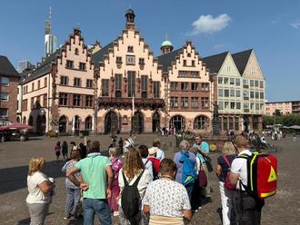 Dort angekommen, erwarteten bereits zwei Stadtführer die Gruppe bei strahlendem Sonnenschein. Nach der Einteilung in kleinere Gruppen und der Ausgabe von Headsets begann der Rundgang durch die Neue Altstadt. Auf dem Programm standen bedeutende Stationen wie der Kaiserdom St. Bartholomäus, die postmodernen Häuser der Saalgasse, der historische Römerberg sowie der Hühnermarkt mit dem Stoltze-Brunnen und dem „Haus zur Goldenen Waage“. Dieses Gebäude zählt zu den 15 originalgetreu rekonstruierten Bauwerken, die aufgrund ihres hohen architektonischen und historischen Wertes seit 2014 wieder erlebbar sind.