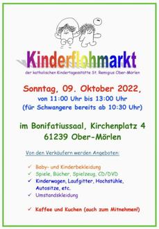 Am nächsten Sonntag, den 09. Oktober 2022, gibt es endlich wieder einen einen Herbst-/Winter-Flohmarkt für Kindersachen der katholischen Kita Ober-Mörlen. Der Flohmarkt findet von 11:00 bis 13:00 Uhr im Bonifatius-Saal. Schwangere erhalten bereits ab 10:30 Uhr Einlass.
