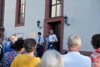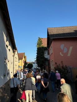 Zum bereits dritten öffentlichen Briefträgerrundgang in 2024 hatte die FWG Fraktion Ober-Mörlen interessierte Bürgerinnen und Bürger geladen. Bei herrlichem Spätsommerwetter fanden sich zwischen 80 und 100 Personen auf dem kath. Kirchhof ein, um die Tour mitzuerleben. Begrüßt wurden diese von den FWG-Vorsitzenden Kai Ilge und Stefan Schraub um dann direkt von "Briefträger Josef", alias Kai Schraub, durch die Ortsgeschichte(n) geführt zu werden. In den Höfen und auf den Plätzen, die angesteuert wurden, wurde es mitunter etwas eng. Ein Besuch des "Totengräberhäuschens" im Gässchen oder einen Einblick in die historische Schlacht am Johannisberg mit Dreispitzhut am Standort der ev. Kirche gaben den Gästen neue Einblicke in alte Zeiten. Der "Schinderhannes" war ebenso Thema des Rundgangs wie auch die Bauernpoesie, die im Wetterauer Mundartgedicht "Das Kellerloch" zu Gehör kam. Die Teilnehmerinnen und Teilnehmer waren in bester Laune als es zum Schloss weiterging. Dort angekommen hielt ein "Mirler-Narr" aus dem Giebelfenster eine Hexenpuppe, als das Thema Hexenverfolgung in der Heimat anstand. Ein großes Gruppenfoto folgte auf der Terrassenempore. Nach dem Besuch des Pfarrgartens mit Pfarrhaus ging es auf den kath. Kirchplatz zum Abschluss. Beide Vorsitzende sprachen erneut zu den Besucherinnen und Besuchern, dankten dem Briefträger herzlichst für dessen Beiträge und verabschiedeten die Gäste. Im Anschluss war im "Goldenen Hirsch" reserviert, wo bei gemütlichem Beisammensein und Oktoberfestbier der Abend harmonisch ausklang.