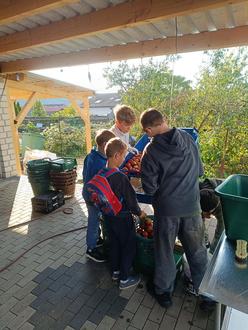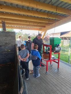 Den Kindern wurde ausführlich erläutert und vorgeführt wie Apfelsaft aus den Äpfeln gepresst wird. Anschließend konnte die Kinder selbst Apfelsaft pressen und ausprobieren.