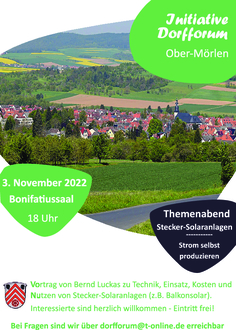 Zum praxisnahen Vortrag „Stecker-Solaranlagen | Strom selbst produzieren“ lädt die Initiative Dorfforum alle Interessierten herzlich ein für: