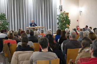Wie 2020 weht auch jetzt, zum zehnten Bücherei-Geburtstag, eine erfrischende Frühlings-Brise durch den proppenvollen Bonifatiussaal, als der Autor seinen Ermittler Daniel Rohde eloquent zu Leben erweckt - als „Kommissar in Wanderschuhen“ und eigentlich privat auf geführter Tour über den Hochröhnweg mit Kollegin Brigitte Schilling, die Rohde nun auch privat zur Seite steht. Das Publikum lernt die Eigenarten der strategisch überzeichneten Wandervögel in der bunt zusammengewürfelten Gruppe um Wanderführer Moritz „Mo“ aus Bayern dank Frühlings bildreicher Formulier- und blitzgescheiter Erzählkunst mit allerlei Dialekten geradezu hautnah und mit allen Klischees kennen. Selbst in seine Trickkiste lässt Tim Frühling seine Zuhörer schauen: „Es ist wichtig, beim Bücherschreiben Bilder entstehen zu lassen, die müssen nicht immer schön sein“, verrät er nach der Beschreibung der unrasierten Frauenbeine einer Protagonistin. Im nächsten Moment springt der Autor auf, um am Abgrund (Bühnenrand) stehend eine brenzlige Situation in der Hochrhön darzustellen. Kaum ist sein Trupp am Roten Moor eingetroffen, um dort in Zelten zu übernachten (dichterische Freiheit, das ist natürlich nicht erlaubt), spitzt sich die Situation zu: Am nächsten Morgen wird Wanderer Frank vermisst. Was nur Daniel und Brigitte erfahren: Im nahen See wird wenig später ein Schlafsack gefunden, und die Polizisten beginnen ihre Undercover-Arbeit…