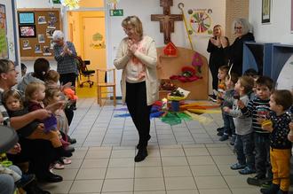 Durch den ganzen Kindergarten standen sie Spalier, die kleinen „Raupen, Schmetterlinge, Bienen und Mäuse“. Sie winkten fröhlich mit Kochlöffeln, Besteckteilen, Handtüchern und Spüllappen und geleiteten „ihre Frau Hartmann“ in den wohlverdienten Ruhestand. Kinder, Erzieherinnen, Elternbeirat, Pfarrgemeinde- und Verwaltungsrat wollten sich nach 20 Jahren in der katholischen Kindertagesstätte St. Remigius bei einer Hauswirtschaftskraft bedanken, die nicht nur alle Kinder beim Namen kannte, sondern umgekehrt auch von allen ins Herz geschlossen worden war.