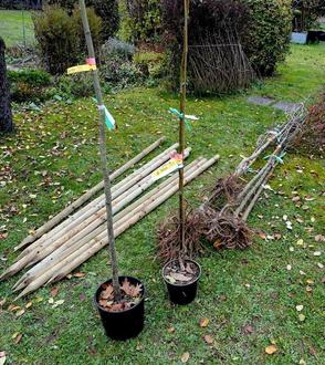 Am vergangenen Samstag konnten die bestellten Bäume und das Zubehör abgeholt werden. Unser Foto zeigt die Zusammenstellung für einen Besteller, der die acht Setzlinge noch am gleichen Tag auf seinem Grundstück am Bottenberg pflanzte. Zuvor waren für die Aktion wieder umfangreiche Vorarbeiten nötig, die komplett ehrenamtlich geleistet werden. Dazu gehören die Anfrage des Sortiments und der Preise bei der Baumschule, das Aktualisieren von Sortenlisten und Bestellschein, die Veröffentlichungen über die verschiedenen Kanäle, die Beratung und Annahme der Bestellungen, das Besorgen des Zubehörs inklusive Zuschneiden von Stricken und Drahthosen, die Sammelbestellung bei der Baumschule und die Anlieferung. Bei dieser Gelegenheit geht ein Dank an Familie Witzel, in deren Garten die Ausgabe stattfindet. Abschließend muss die Aktion natürlich noch ordnungsgemäß abgerechnet werden.