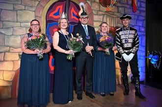 Wenige Augenblicke zuvor hatte sich das scheidende Prinzenpaar Kerstin und André Micelotta mit Hofdame Jasmin Stowasser und Hofmarschall Patrick Feistel am Fuße einer strahlenden Kampagne zum letzten Mal an sein Narrenvolk gewandt. Im Handumdrehen gingen dann Prinzenkappe und Zepter an Prinz Ralph über, die Krone für Prinzessin Sandra wurde sorgfältig auf ihrem Kopf festgesteckt. Fortan überstrahlte ein Prinzenpaar die Szenerie, das mit seiner Freude und Eleganz bereits vor elf Jahren zu begeistern wusste, als es mit Eltern und Kindern im Dreigenerationen-Aufgebot seine erste Regentschaft über Klein Mainz am Usastrand gefeiert hatte.