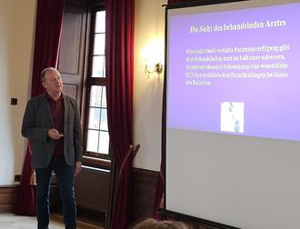 Umfassende Informationen zur Patientenverfügung erhielten die Besucher aus medizinischer Sicht von Dr. med. Götz Sailer, vom Ärztezentrum am Schloss. Es wurde der Aufbau und die Wirkung einer Patientenverfügung erläutert und wie diese in der Praxis funktioniert und Anwendung findet. Es wurde angeregt eine regelmäßige Aktualisierung vorzunehmen. Dr. Sailer gab auch Einblicke in die Palliativ-Medizin und erläuterte zudem die Funktion einer PEG-Sonde (Perkutane endoskopische Gastrostomie-Sonde), die in Bezug auf künstliche Ernährung eine Rolle spielt.