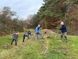 Kaum ist die Streuobsternte und die Baumbestellaktion vorbei, geht es mit Pflegearbeiten weiter, die überwiegend im Winterhalbjahr durchgeführt werden. Den Anfang machte am vergangenen Samstag das „Entkusseln“ von Magerrasen im Weinstraßengraben. Dieses Wort dürfte nur Fachleuten bekannt sein. Es stammt aus Norddeutschland und bedeutet dort, junge Kiefern und Sträucher, sogenannte „Kussel“, von offenen Flächen wie Heidegebieten oder Mooren zu entfernen. Ohne Schafbeweidung, Nachmahd und Entkusseln würden solche Lebensräume rasch zuwachsen.