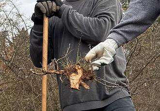 Das oberflächliche Abschneiden mit Astscheren und Motorsensen wäre weniger anstrengend, hat aber den Nachteil, dass die dornigen Auswüchse immer wieder kommen. Auf dem zweiten Foto ist zu sehen, wie stark dabei die Wurzeln über Jahre werden. Daher versuchen wir auf dieser für Ober-Mörlen einzigartigen Fläche, mit Spaten und Hacken die Brombeeren, Heckenrosen, Weißdörner und kleinen Eichen möglichst nachhaltig zu entfernen. So können Spaziergänger im August von der Weinstraße aus den Blick auf das wunderbar blühende Heidekraut genießen.