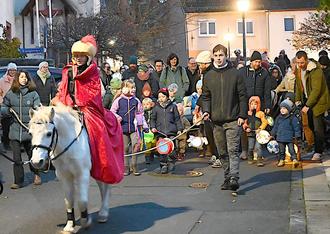 „Sankt Martin“ reitet der großen Menschentraube mit ihren leuchtenden Laternen voran durchs Dorf