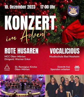 An dem zweiten Adventsonntag lädt der MCC-Musikzug "Rote Husaren" zu dem traditionellen Adventskonzert in der stimmungsvoll illuminierten Kirche St. Remigius in Ober-Mörlen ein.