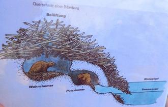 Querschnitt einer Biberburg mit dem Eingang unter Wasser sowie dem Putz-und Wohnzimmer