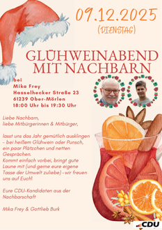 in der nächsten Woche ist es wieder soweit: Unter dem Motto „Lust auf einen Glühwein – im Gespräch mit ihren CDU-Kandidaten für die Gemeindevertretung aus der Nachbarschaft“ lädt die CDU Ober-Mörlen zum Ende des Jahres die Nachbarschaft aber natürlich auch alle übrigen Bürgerinnen und Bürger zum Glühweinabend ein. Start der Reihe am Dienstag 09.12.25, 18.00 -19.30 Uhr in der Hasselhecker Straße 23 im Hof bei Mika Frey (Spedition Frey) statt.