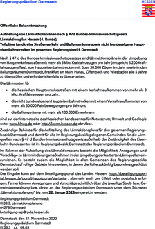 Zuständige Behörde für die Aufstellung des Lärmaktionsplans für den gesamten Regierungsbezirk Darmstadt und damit für alle im Regierungsbezirk gelegenen Gemeinden für die Lärmquellen nach § 47 d Bundes-Immissionsschutzgesetz außerhalb der Zuständigkeit des Eisenbahn-Bundesamtes ist im Regierungsbezirk Darmstadt das Regierungspräsidium Darmstadt.