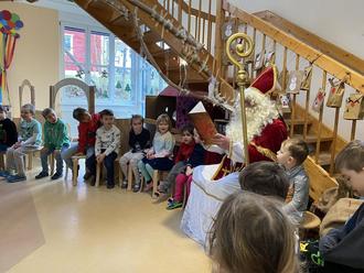 Auch in diesem Jahr ließ es der Nikolaus sich nicht nehmen und besuchte die Kinder der evangelischen Kita Sonnenstrahl in Langenhain-Ziegenberg. Viele leuchtende Augen konnte man sehen, als dieser mit einem großen Sack tatsächlich wieder in der Tür stand. Nach einigen Liedern sprach auch der Nikolaus, was er im letzten Jahr erlebt hat und was er beobachtet hatte. Natürlich hat er vorher die Socken der Kinder in der Kita von seinen Helfern abhängen und füllen lassen.