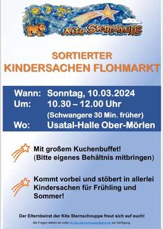 Am Sonntag, den 10.03.2024 findet zum wiederholten Male der sortierte Kindersachen Flohmarkt der Kita Sternschnuppe statt. Wir freuen uns, dass der Flohmarkt jedes Jahr so viele Interessenten anzieht. Auch in diesem Jahr, bietet der Flohmarkt wieder viele sortierte Klamotten für den Frühling und Sommer. Zudem gibt es eine große Auswahl an Spielsachen, Büchern und vielem mehr. Vorbeischauen lohnt sich!