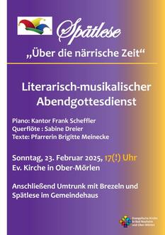| 17:00 Uhr | Literarisch-musikalischer Abendgottesdienst „Närrische Spätlese“ in Ober-Mörlen |