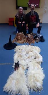 Am Donnerstag waren Sabine Schimkus und Wolfgang Theiß von den „Wintersteingeistern“ Ober-Mörlen mit ihren Kostümen und den geschnitzten Masken in der Kita.