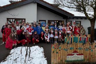 Das Kita-Leitungsteam mit den Abordnungen der beiden Ober-Mörler Karnevalsvereinen vor der Kita Sternschnuppe