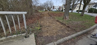 Das wird jetzt alles bereinigt. Künftig kann man vom Bürgersteig Adam-Geck-Str. die Seite wechseln auf einen neuen Gehweg über die „Kastanienwiese“.