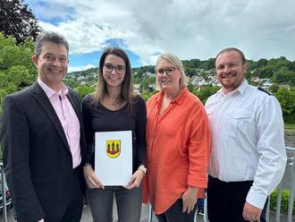 Bürgermeister Markus Bäckel, Hauptamtsleiter Lars Wagner, Personalleiterin Mona Haas und alle Kolleginnen und Kollegen gratulieren ihr zu dieser großartigen Leistung!