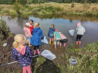 In zwei Gruppen aufgeteilt ging es dann los an den Teich und den Fluss. Mit Keschern wurden verschiedene Tiere aus dem Wasser gefischt, in helle, mit Wasser gefüllte Wannen gesetzt und betrachtet. Im Teich konnten die Kinder Frösche beobachten und einige Kaulquappen fangen. Offensichtlich waren diese von zwei unterschiedlichen Froscharten, denn sie waren - trotz gleichem Entwicklungsstadium - sehr unterschiedlich groß. Und bei genauerem Hinschauen sahen sie auch unterschiedlich aus. Spannend waren auch die Rückenschwimmer (Wasserkäfer, die tatsächlich beim Schwimmen den Bauch nach oben halten) und die vielen Wasserläufer.