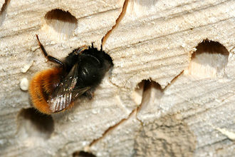 Die Gehörnte Mauerbiene legt ihr Nest in Hohlräumen an. Ein Insektenhotel kann ihr dabei helfen.