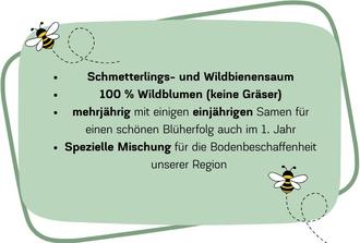 Unser Lieferant ist ein führender Hersteller von Sämereien in Deutschland. Mit professioneller Beratung durch den BUND Fulda-Künzell haben wir diese Blühmischung speziell für Wildbienen und Schmetterlinge gewählt. Eine Pflanzanleitung befindet sich auf der Rückseite des Tütchens.