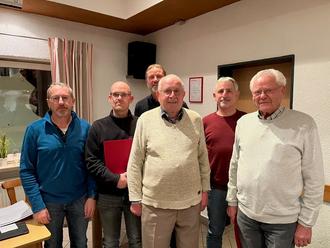 v.l.n.r.: Lothar Klüber (für 50 Jahre), Alexander Helfrich (für 25 Jahre), Gerhard Bieneck (1. Vorsitzender), Ottmar Trapp (für 75 Jahre), Dieter Heil (für 50 Jahre) und Erich Werner (für 70 Jahre). (Es fehlen: Artur Bosold, Thomas Krieger und Andreas Fröhlich für 25 Jahre Mitgliedschaft und Dieter Heinisch sowie Meinhard Bahr für 50 Jahre Mitgliedschaft)