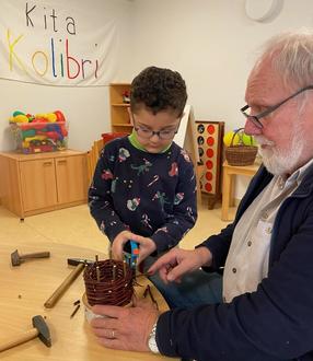 Im Kindergarten Kolibri in Petersberg wurde auch in diesem Jahr die traditionelle Osteraktion mit großer Begeisterung von den Workshopkindern durchgeführt. Unter der Anleitung von Felix Gaul und drei Erzieherinnen flochten die Kinder ihre eigenen Osterkörbchen aus Weidenzweigen. Diese kreative Aktivität erstreckte sich über drei Tage und sorgte für strahlende Kinderaugen.