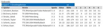 Am 02.03. und 03.03.2024 wurden das Kreisendranglistenturnier im Tischtennis in Hünfeld ausgetragen. Zuvor mussten sich die Endrundenteilnehmer beim Vorranglisten-Turnier in Künzell hierfür qualifiziert. In der Spielklasse Jugend 15 gelang dies vom TV Petersberg Jakob Strube und Andrei Biclineru. Das Teilnehmerfeld beim Endranglistenturnier bestand aus 10 Spieler, welche in 2 Gruppen aufgeteilt waren. In diesen musste jeder gegen jeden spielen. Am Ende der Gruppenphase belegten Jakob Strube und Andrei Biclineru mit 3:1 Siegen jeweils den 2. Platz in ihrer Gruppe. Jetzt mussten Sie in der Endrunde noch gegen die drei Besten aus der jeweils anderen Gruppe spielen. Dabei kam es auch zu dem direkten Duell von Jakob Strube gegen Andrei Biclineru. In einem hochklassigen und sehr engen Spiel konnte sich Jakob Strube knapp gegen Andrei Biclineru durchsetzen. Allerdings verlor Jakob Strube danach noch gegen den ungeschlagenen Sieger der Endrangliste Bastian Schubert vom TTC Fulda-Maberzell, so dass am Ende des Turniers, auf Grund des besseren Satzverhältnisses, Andrei Biclineru vor Jakob Strube rangierte. Mit dieser tollen Leistung haben sich die beiden verdient für das Bezirksvorranglistenturnier, das im Mai in Flieden stattfindet, qualifiziert. Die folgende Tabelle zeigt die Ergebnisse der Endrunde.