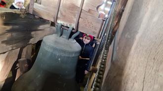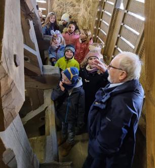 Staunende Gesichter betrachteten die Glocken, die in stabilem, dickem Gebälk hängen. Einige durften auch mit einem Klöppel die Glocken zum Klingen bringen.