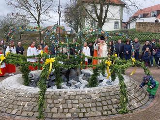 Pfarrer Ludwig segnet den Osterbrunnen in Marbach.