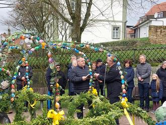 In seiner Begrüßungsrede dankte der Vorsitzende den vielen fleißigen Händen, die es in den letzten Wochen geschafft haben, den Brunnen so prächtig zu gestalten. Dabei wies er auf die besondere Konstruktion des Osterbrunnens hin, die das Gefälle des Untergrundes durch unterschiedlich große Bögen ausgleicht. Der Brunnen ist in der Form einer majestätischen, zweistöckigen Krone gestaltet, die von einem dreidimensionalen Kreuz überragt wird, das nach Angaben seines Erbauers die Dreifaltigkeit repräsentiert.