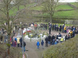 Der Osterbrunnen in Marbach wurde am Palmsonntag von unserem HH. Pfarrer Ludwig feierlich eingeweiht. Nach der hl. Messe kamen bei kalten Temperaturen, aber ansonsten trockenem Wetter zum Brunnen in der Josef-Damian-Schmitt-Straße über 150 interessierte Gäste, "Mäabicher unn Freeme", um zusammen mit den Helfern des Heimatvereins die neue Tradition eines Osterbrunnens in Marbach ins Leben zu rufen.