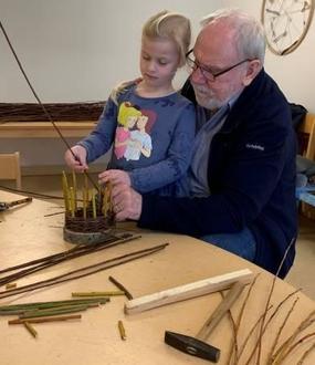 Traditionell werkelten die Workshopkinder ihr Osternest mit „Opa Felix“ aus Weide. Die Baumscheiben, die für die Nester benötigt werden, hatte der Bauhof vorbereitet. Unter der Assistenz der Workshopkinder bohrte Karolin Löcher in die Baumscheiben und klebte dickere Aststücke hinein. Felix Gaul brachte Weidenzweige in verschiedener Färbung und Länge und das benötigte Werkzeug mit. Vom Team erhielt Felix Unterstützung und dann konnte es auch schon losgehen.