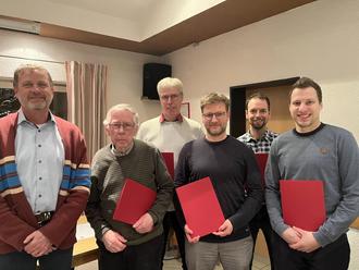 v.l.n.r.: Gerhard Bieneck (1. Vorsitzender), Hubert Schmidt (70 Jahre), Gerhard Heres (50 Jahre), Mathias Bergener, Jonas Bohl und Pascal Trautrims (25 Jahre) (Es fehlen: Mario Zura, Pascal Heil, Ralf Will und Martin Pietrucha für jeweils 25 Jahre Mitgliedschaft)