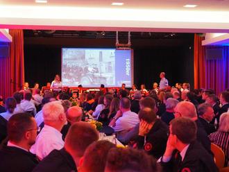 Nach den kurzweiligen und abwechslungsreichen Grußworten kam es zum Hauptprogrammpunkt des Abends. Im Sommer letzten Jahres hat sich ein engagiertes, mehrköpfiges Team zusammengefunden mit dem Ziel, die Geschichte der Freiwilligen Feuerwehr Steinau in einer Chronik neu aufzuarbeiten und zu präsentieren. Nach unzähligen Stunden Arbeit wurde dies mit der Fertigstellung einer über zweihundert Seiten starken Chronik erreicht. Aufgelockert durch Videobeiträge und musikalische Intermezzi des Musikzuges führten Michaela und Christoph Möller im Wechsel durch die wichtigsten Ereignisse aus einhundert Jahren Feuerwehr Steinau - von der Gründung als Freiwillige Feuerwehr Steinau-Steinhaus, besonderen Einsätzen und prägenden Persönlichkeiten wie Franz Frohnapfel und Anton Möller über die sich ständig weiterentwickelnde technische Ausstattung bis zu den großen Erfolgen der Jugendfeuerwehr. Passenderweise hatten einige der ehemaligen Jugendfeuerwehrmitglieder ihre Goldmedaillen mitgebracht, die sie als Sieger der Deutschen Meisterschaft der Jugendfeuerwehren 1983 in Kiel errungen.