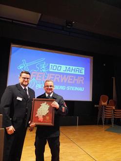 Nach einem Festgottesdienst in der Steinauer Kirche hatten die Floriansjünger zur Abendveranstaltung ins Giso-von-Steinau-Haus geladen, um in angemessenem Rahmen zurückzuschauen auf einhundert Jahre Gott zur Ehr, dem Nächsten zur Wehr im Petersberger Ortsteil. Der Einladung gefolgt sind neben Landrat Bernd Woide, dem selbst aus Steinau stammenden Ersten Kreisbeigeordneten Frederik Schmitt und Bürgermeisterin Claudia Brandes auch Jason Freeman als Geschäftsführer des Landesfeuerwehrverbandes Hessen sowie der Verbandsvorsitzende des Kreisfeuerwehrverbands Fulda, Patrick Weber.